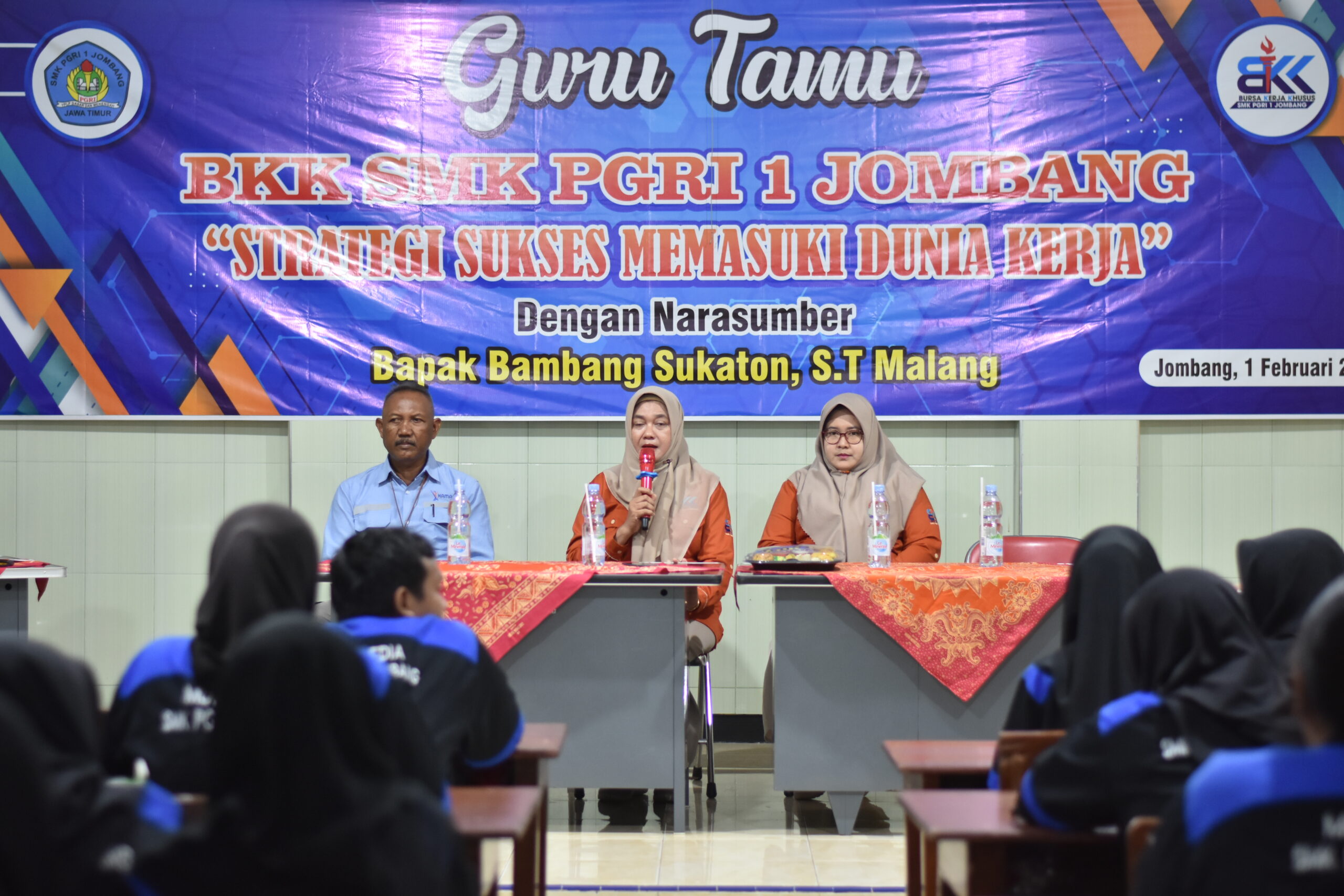 BKK SMK PGRI 1 Jombang menyelenggarakan kegiatan guru tamu dengan tema "Strategi Sukses Memasuki Dunia Kerja". Narasumber, Bapak Bambang Sukaton, S.T., dari Malang, berbagi pengetahuan dan pengalaman mengenai persiapan memasuki dunia kerja. Kegiatan ini dilakukan pada tanggal 1 Februari 2024. Beliau menekankan pentingnya pengembangan soft skills seperti komunikasi dan kerja sama, penguasaan hard skills sesuai bidang, serta membangun mentalitas kerja yang tangguh.